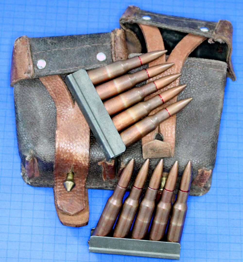 | RUSSIAN 7.62MM MOSIN NAGANT RIFLE AMMO POUCH WITH X20 INERT ROUNDS ON CLIPS in very good order with signs of use. Priced £55.00 |